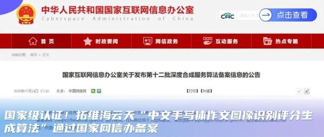 国家互联网信息办公室发布第十二批深度合成服务算法备案公告,拓维海云天自主研发的核心技术成果——“中文手写体作文图像识别评分生成算法” 成功通过备案(备案编号:250011号)。这是拓维海云天在人工智能领域首次获得国家级合规认证,不仅是对公司技术实力、数据安全与合规能力的高度认可,更为教育智能评测行业树立了全新标杆。
