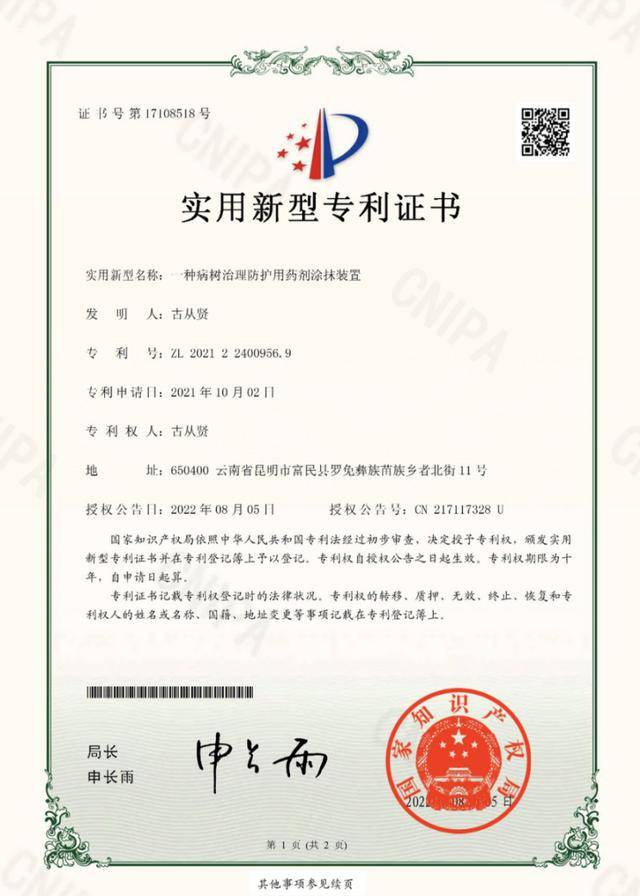 2021年,结合果树根腐、干腐的问题,古从贤研究出了一套系统的方法,并申报了“一种病树治理防护用药涂抹装置”的实用新型专利,获得了国家知识产权局颁发的证书。