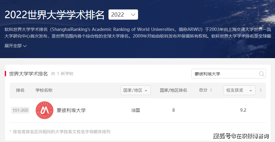 软科世界大学学术排名中,蒙彼利埃大学排在世界151-200位,处于法国第8名。