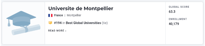 US.NEWS世界大学学术排名中,蒙彼利埃大学排在世界194位,处于法国第6名。